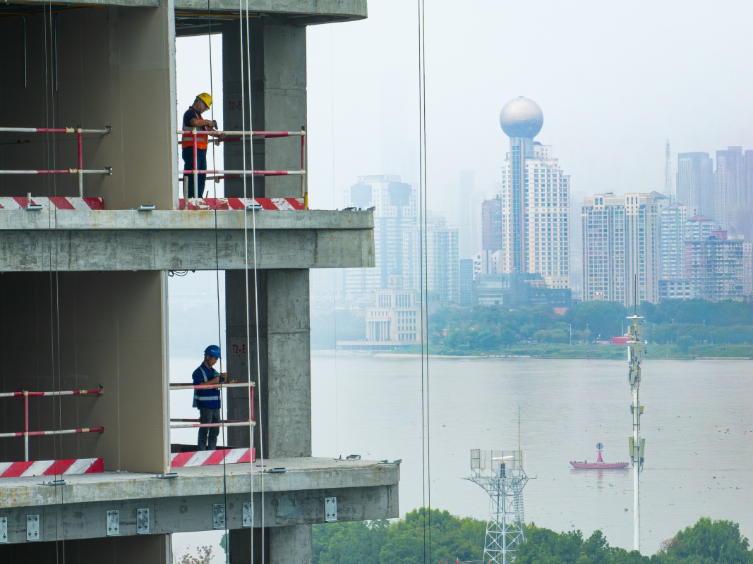 10月1日,中建三局三公司工人在位于湖北省武漢市武昌區(qū)一處項(xiàng)目工地進(jìn)行施工作業(yè)(無人機(jī)照片)。