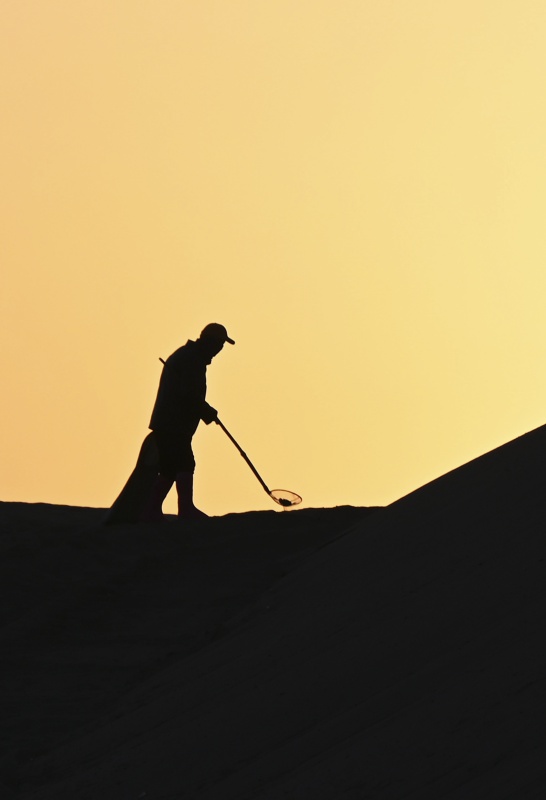 10月1日,保潔人員在甘肅省敦煌市鳴沙山月牙泉景區(qū)保潔。