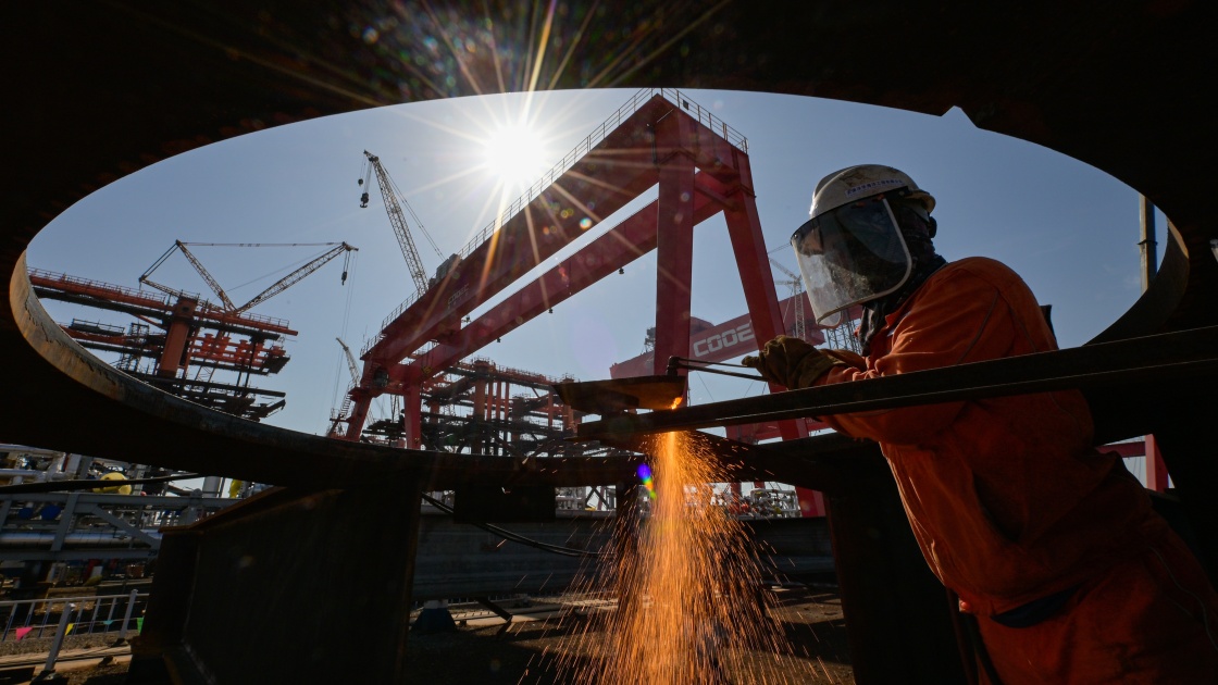 10月1日,在天津市濱海新區(qū),渤海油田工人進(jìn)行氣割作業(yè)。