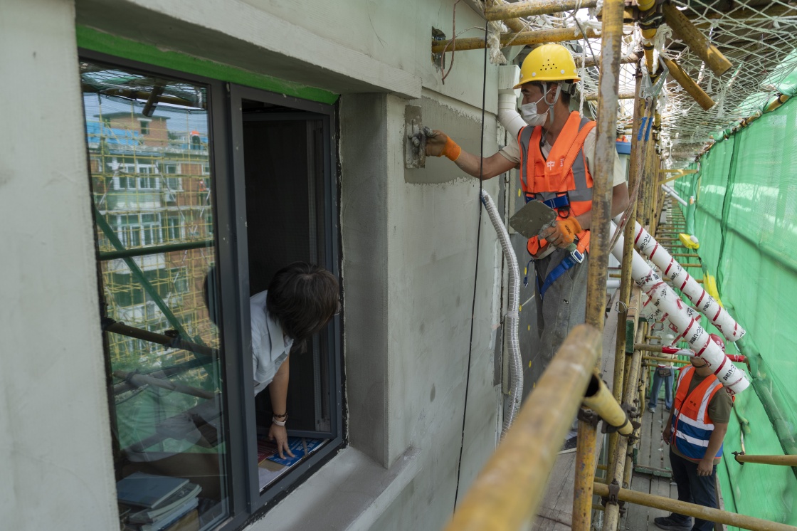 10月1日,在北京東城區(qū)和平里街道,中建三局集團(tuán)有限公司工人進(jìn)行外墻保溫板抗裂砂漿施工。