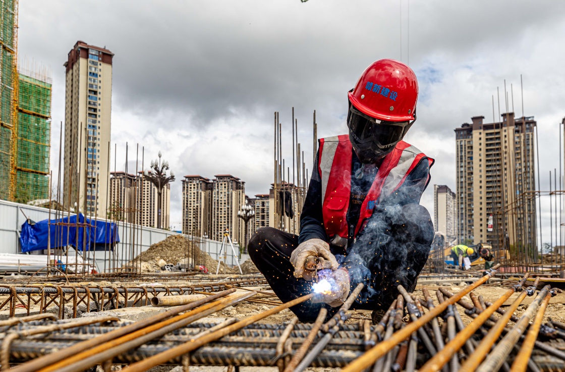 10月1日,工人在貴州省黔西市一建筑工地進(jìn)行鋼筋焊接作業(yè)。