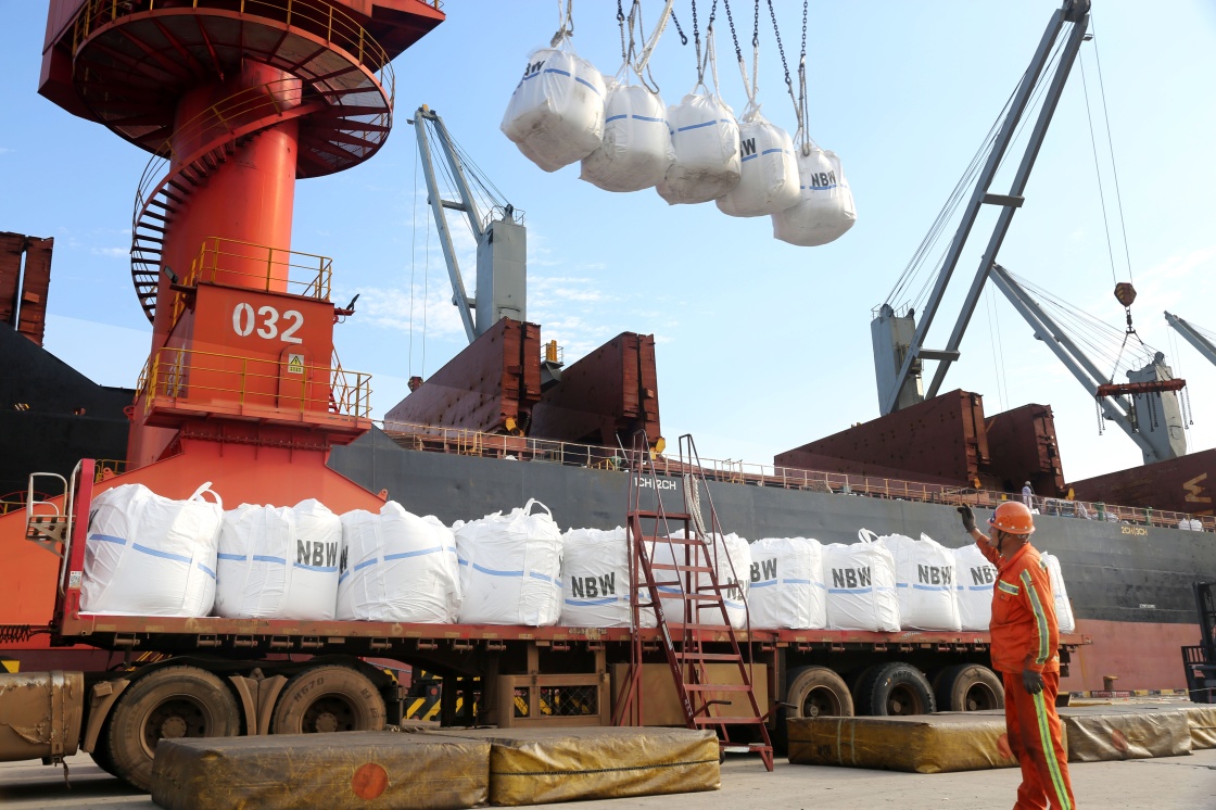 10月1日,碼頭工人在江蘇省連云港港東方港務(wù)分公司碼頭上忙碌。