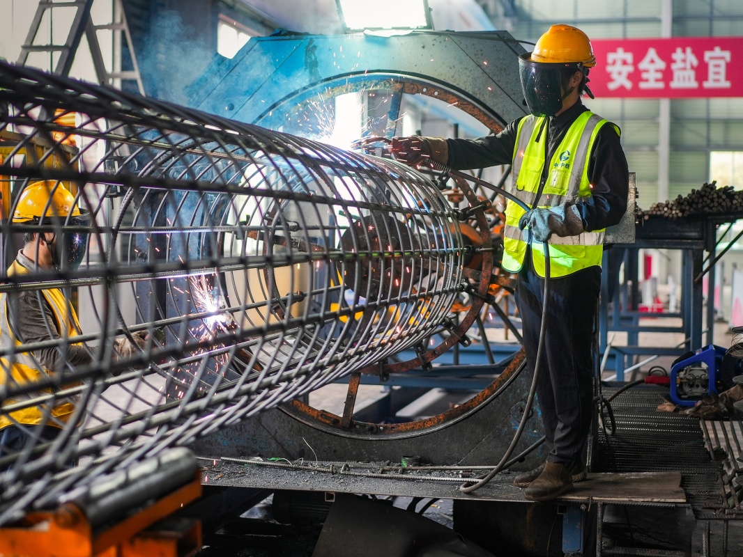 10月1日,工人在位于江蘇省興化市陳堡鎮(zhèn)的中鐵上海工程局鹽宜鐵路項(xiàng)目部鋼筋加工場(chǎng)進(jìn)行焊接作業(yè)。