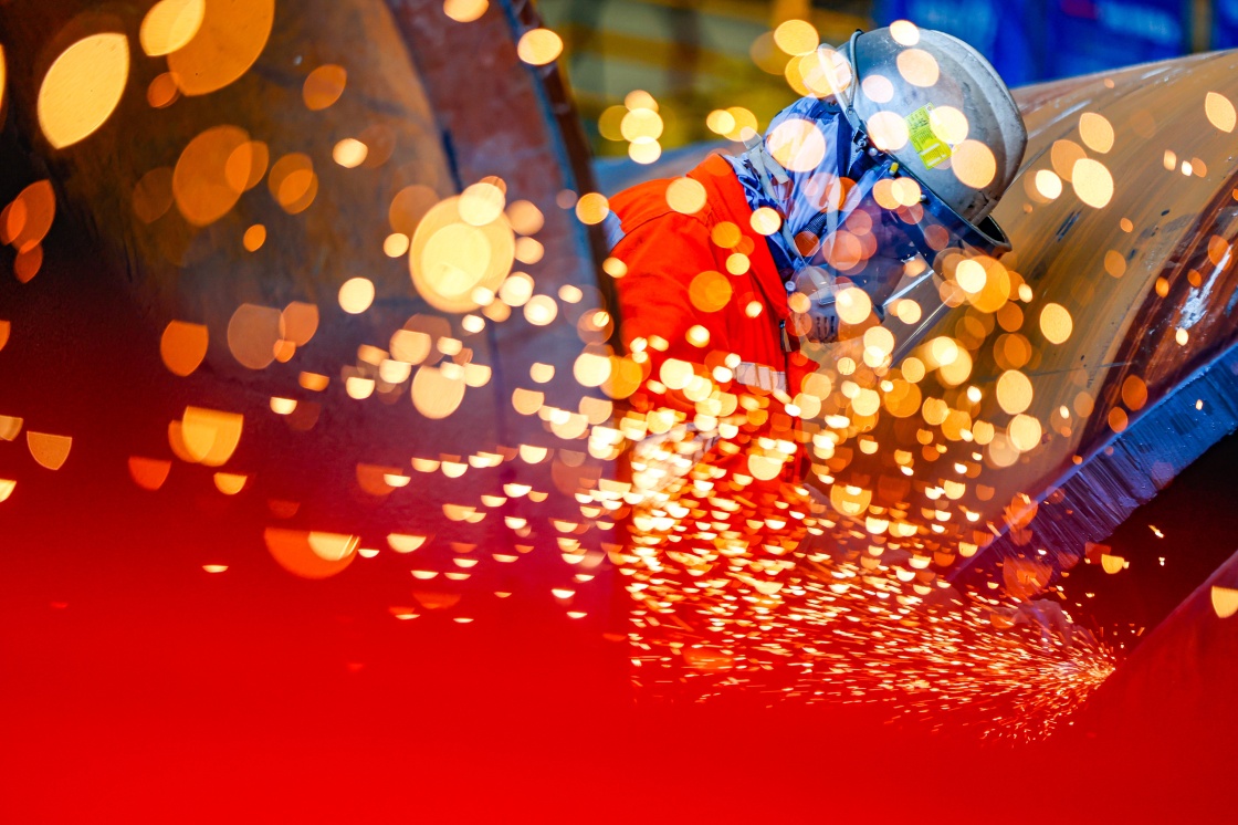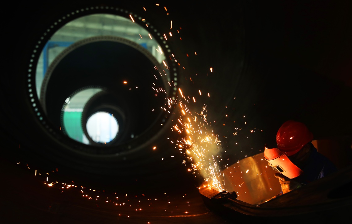 10月1日,在湖南省衡陽(yáng)市衡山縣經(jīng)濟(jì)開發(fā)區(qū),恒岳重鋼鋼結(jié)構(gòu)工程有限公司員工進(jìn)行風(fēng)電塔筒的部件加工作業(yè)。