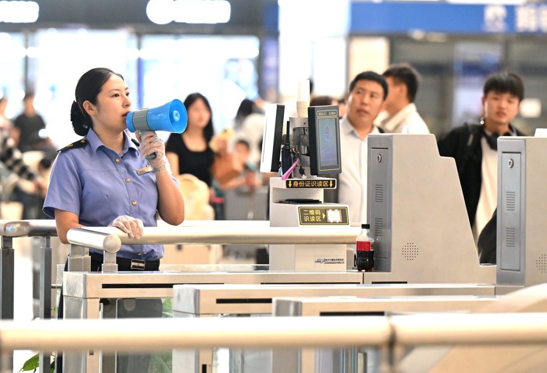 10月1日,鐵路工作人員在河北石家莊火車站候車大廳忙碌。