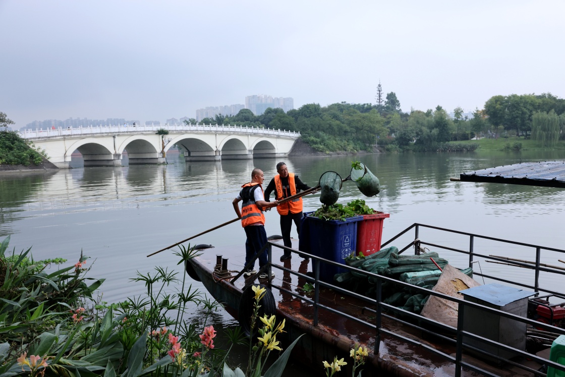 10月1日,四川省眉山市東坡區(qū)環(huán)衛(wèi)工人在東坡湖上打撈水草。