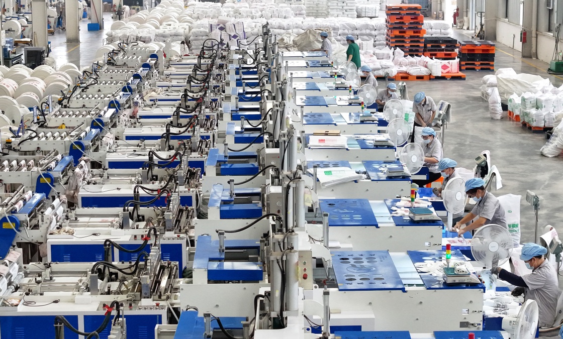 10月1日,在湖南省衡陽(yáng)市衡山縣經(jīng)濟(jì)開發(fā)區(qū),榮宸塑業(yè)有限公司員工在生產(chǎn)線上作業(yè)(無人機(jī)照片)。