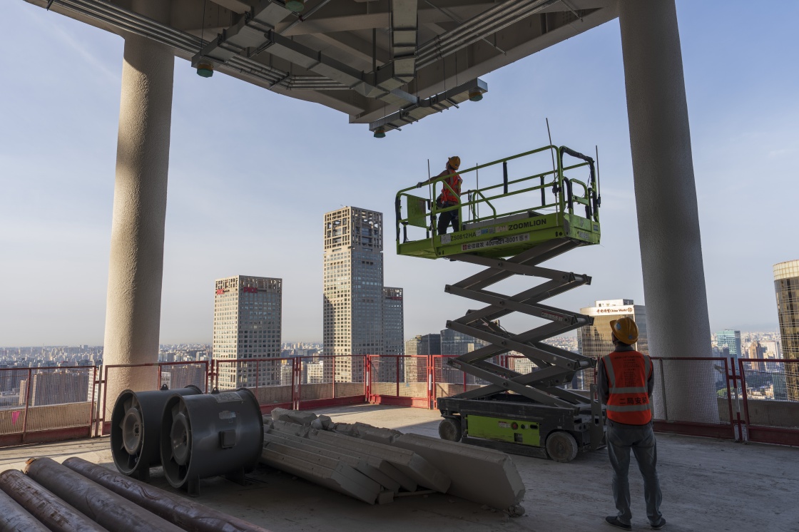 10月1日,在北京CBD核心區(qū)Z3項(xiàng)目上,中建二局安裝工程有限公司機(jī)電安裝工人在施工。
