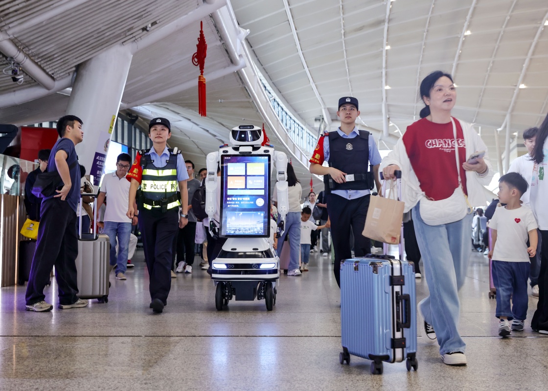 10月1日,武漢鐵路公安處武漢站派出所民警在武漢站巡查。