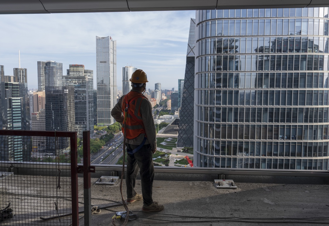 10月1日,在北京CBD核心區(qū)Z3項(xiàng)目上,玻璃幕墻安裝工人在施工間歇觀賞城市景色。
