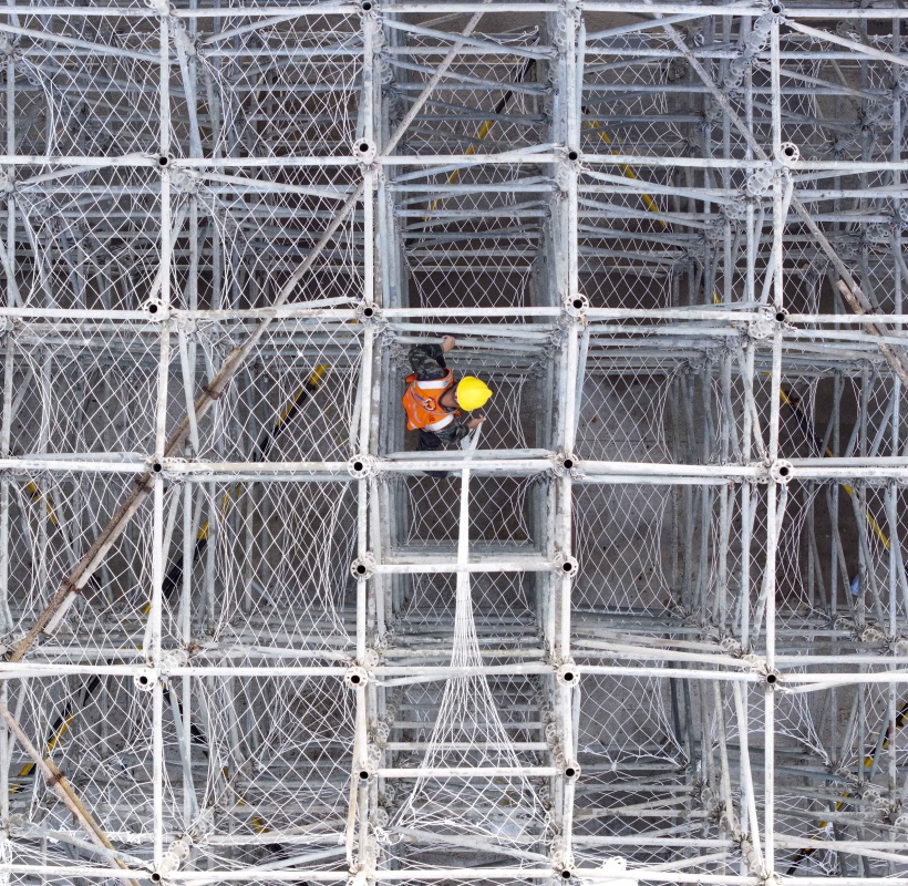 10月1日,工人在江蘇省泰州市高鐵南站綜合交通樞紐一項(xiàng)目為井字架安裝防護(hù)網(wǎng)(無人機(jī)照片)。
