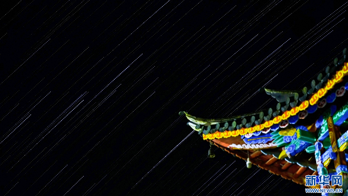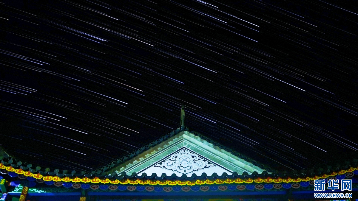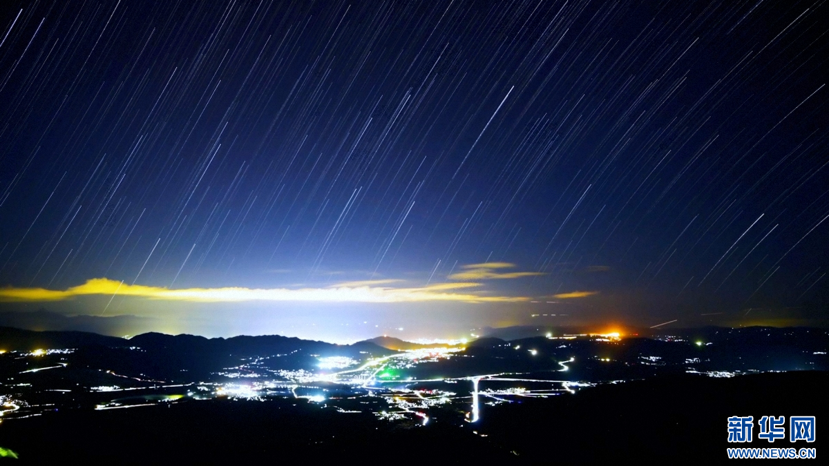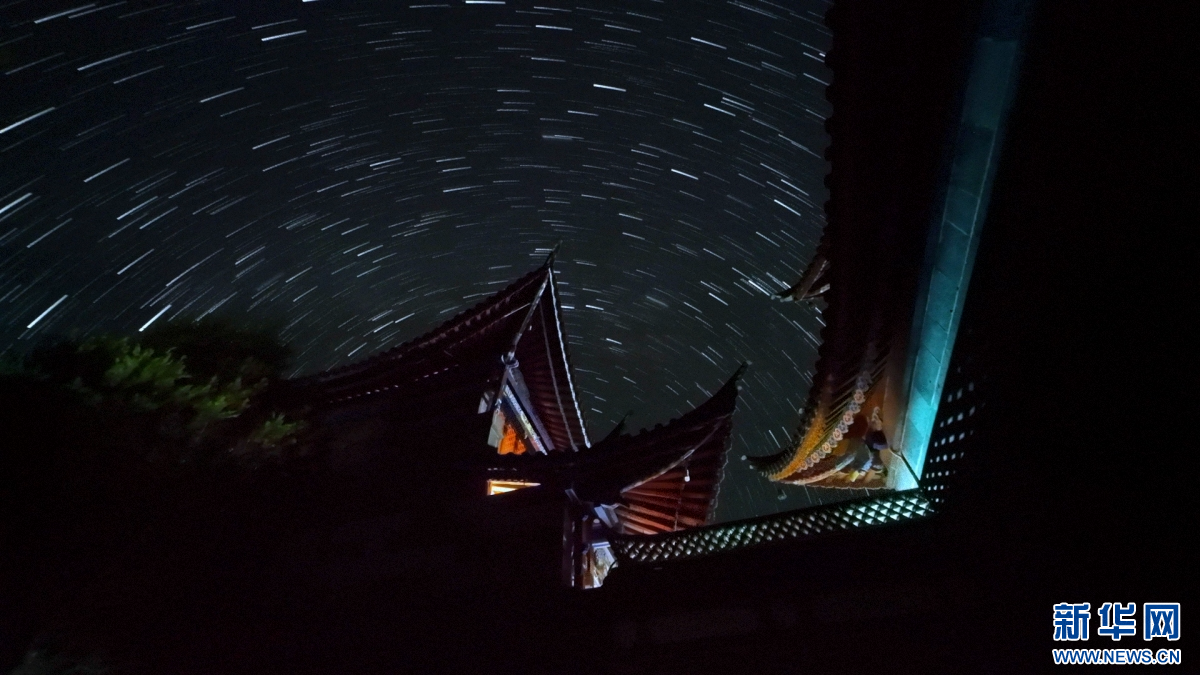 近日,攝影師在云南省騰沖市新岐冒盔山用延時(shí)攝影拍攝到夜空群星璀璨,星軌在山頭旋轉(zhuǎn),夢(mèng)幻而浪漫。(趙輝 李諺 錢林川)