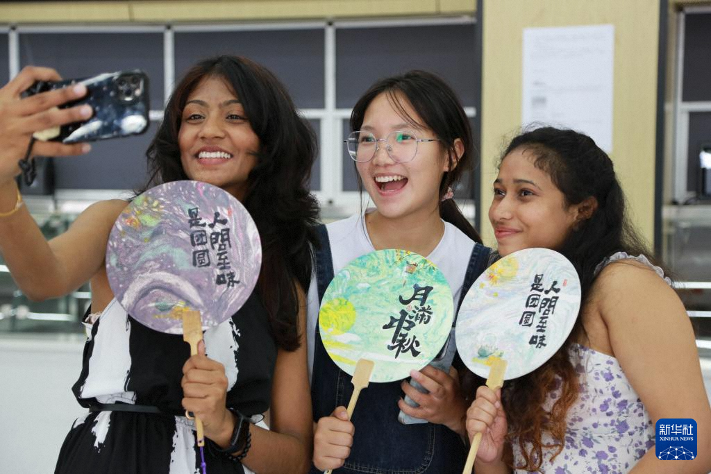 10月6日,在位于云南省蒙自市的紅河學(xué)院,中外學(xué)生參加“千里共嬋娟,青年話團(tuán)圓”中秋節(jié)茶話會活動。新華社發(fā)(薛瑩瑩攝)