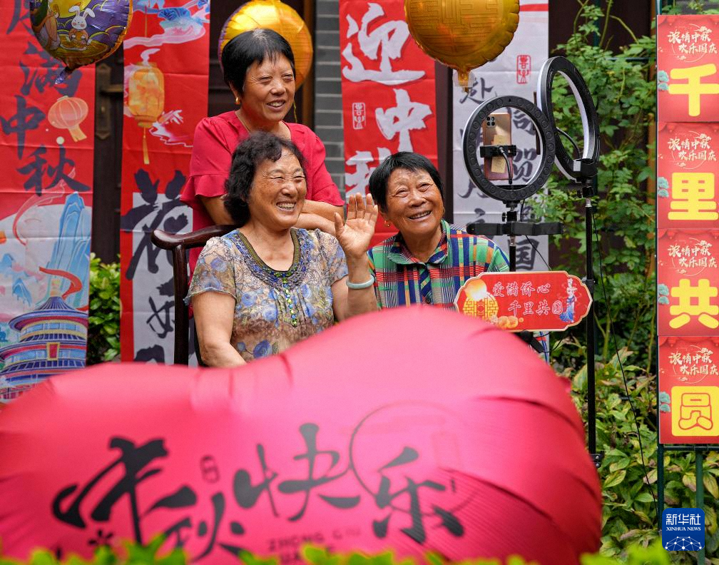 10月6日,在江蘇省海安市墩頭鎮(zhèn)寶祥村“情滿中秋 愛暖僑心”活動中,僑眷們與海外親人視頻連線。新華社發(fā)(周強(qiáng)攝)
