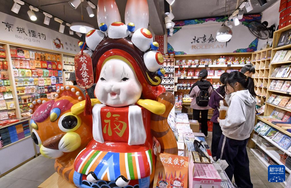 10月6日,游客在北京煙袋斜街的商店里選購北京兔兒爺文創(chuàng)產(chǎn)品。新華社記者 李欣 攝