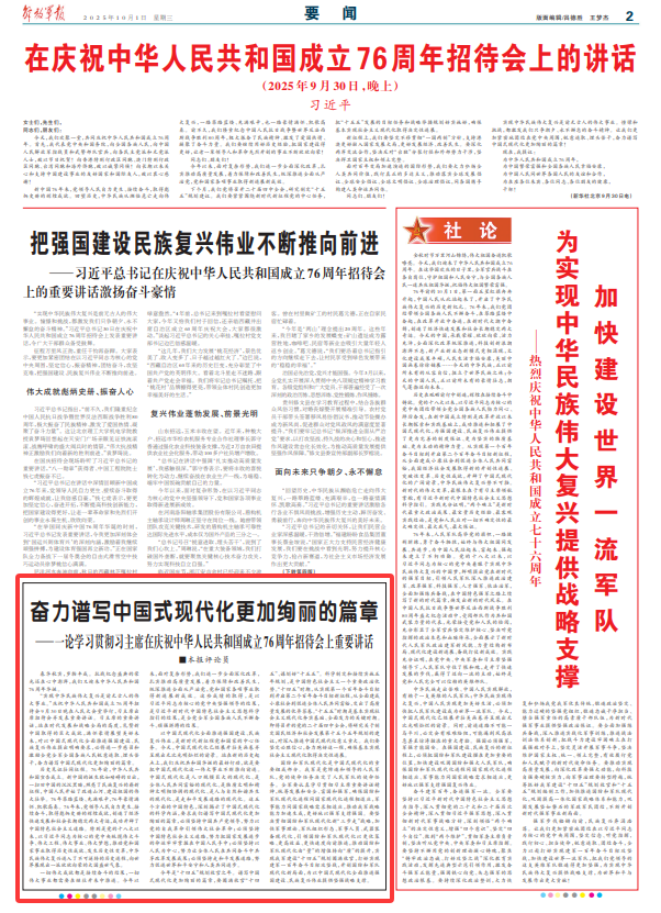 “實(shí)現(xiàn)中華民族偉大復(fù)興是前無(wú)古人的偉大事業(yè)?!睉c祝中華人民共和國(guó)成立76周年招待會(huì)9月30日晚在人民大會(huì)堂舉行,習(xí)主席出席招待會(huì)并發(fā)表重要講話。習(xí)主席的重要講話,站在時(shí)代發(fā)展和戰(zhàn)略全局的高度,禮贊新中國(guó)取得的巨大成就,滿懷豪情展望美好未來(lái),對(duì)以中國(guó)式現(xiàn)代化全面推進(jìn)強(qiáng)國(guó)建設(shè)、民族復(fù)興偉業(yè)提出明確要求,必將進(jìn)一步感召和激勵(lì)全黨全軍全國(guó)各族人民銳意進(jìn)取、埋頭苦干,奮力譜寫中國(guó)式現(xiàn)代化更加絢麗的篇章。