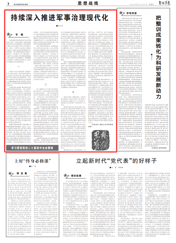 全面加強(qiáng)軍事治理是我們黨治軍理念和方式的一場深刻變革,是加快國防和軍隊(duì)現(xiàn)代化的戰(zhàn)略要求,是推進(jìn)國家治理體系和治理能力現(xiàn)代化的重要方面。黨的二十屆四中全會(huì)指出,要加快先進(jìn)戰(zhàn)斗力建設(shè),推進(jìn)軍事治理現(xiàn)代化,鞏固提高一體化國家戰(zhàn)略體系和能力。新征程上,我們要深入學(xué)習(xí)貫徹黨的二十屆四中全會(huì)精神,深刻理解把握推進(jìn)軍事治理現(xiàn)代化的戰(zhàn)略意義、邏輯鏈路與實(shí)踐要求,不斷強(qiáng)化使命擔(dān)當(dāng),以高水平治理推動(dòng)我軍高質(zhì)量發(fā)展。