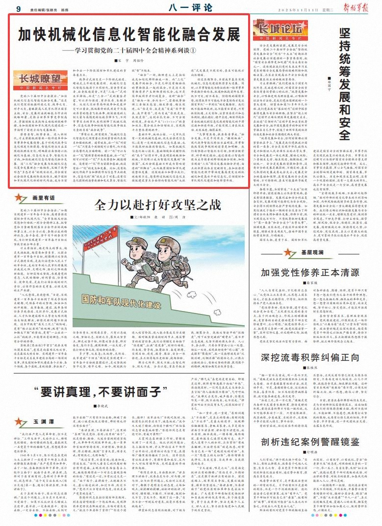 黨的二十屆四中全會(huì)提出:“加快機(jī)械化信息化智能化融合發(fā)展?!边@是我們黨深刻把握科技之變、戰(zhàn)爭之變、對手之變,著眼提高人民軍隊(duì)捍衛(wèi)國家主權(quán)、安全、發(fā)展利益戰(zhàn)略能力作出的戰(zhàn)略部署,是搶占世界軍事競爭制高點(diǎn)、掌握制勝未來戰(zhàn)場主動(dòng)權(quán)的戰(zhàn)略舉措,為加快國防和軍隊(duì)現(xiàn)代化建設(shè)進(jìn)一步指明了前進(jìn)方向與發(fā)展路徑。