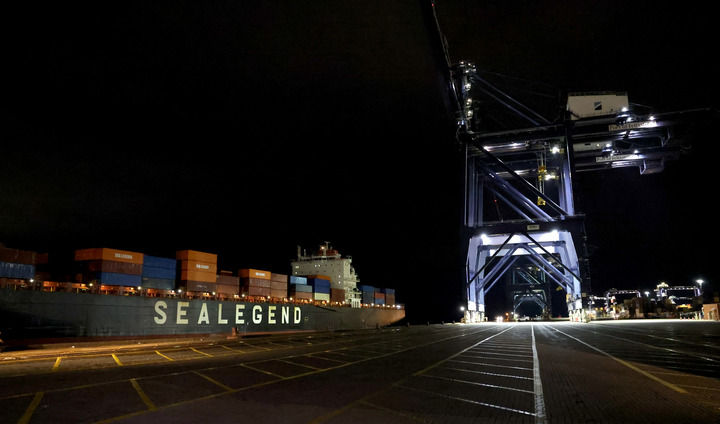 2025年10月13日,在英國費利克斯托港,中歐北極快航航線首艘貨船駛?cè)氪a頭。新華社記者 李穎 攝