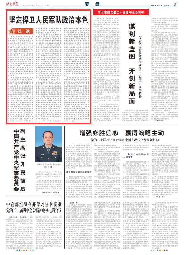 勇于自我革命是我們黨最鮮明的品格和最大優(yōu)勢,勝敵先勝己是人民軍隊走向強(qiáng)大、戰(zhàn)勝強(qiáng)敵的歷史邏輯。藍(lán)圖已繪就,奮進(jìn)正當(dāng)時。人民軍隊將沿著黨指引的方向,在革命性鍛造中向著實現(xiàn)黨在新時代的強(qiáng)軍目標(biāo)砥礪前行。讓我們更加緊密地團(tuán)結(jié)在以習(xí)近平同志為核心的黨中央周圍,堅持以習(xí)近平新時代中國特色社會主義思想為指導(dǎo),全面貫徹黨的二十大和二十屆歷次全會精神,深入貫徹習(xí)近平強(qiáng)軍思想,深入貫徹新時代軍事戰(zhàn)略方針,深刻領(lǐng)悟“兩個確立”的決定性意義,增強(qiáng)“四個意識”、堅定“四個自信”、做到“兩個維護(hù)”,貫徹軍委主席負(fù)責(zé)制,始終忠誠核心、擁戴核心、維護(hù)核心、捍衛(wèi)核心,踔厲奮發(fā)、勇毅前行,全力以赴打好實現(xiàn)建軍一百年奮斗目標(biāo)攻堅戰(zhàn),加快把人民軍隊建成世界一流軍隊,為以中國式現(xiàn)代化全面推進(jìn)強(qiáng)國建設(shè)、民族復(fù)興偉業(yè)提供堅強(qiáng)戰(zhàn)略支撐。