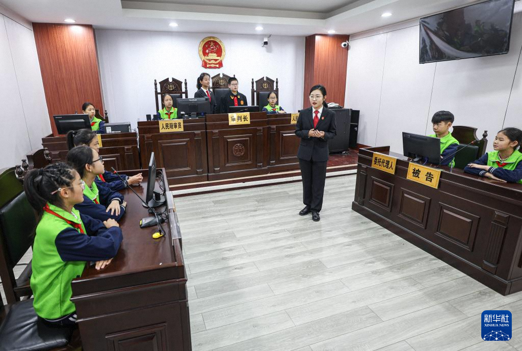 12月2日,在山東省榮成市人民法院民事審判庭,法院工作人員指導(dǎo)學(xué)生沉浸式體驗(yàn)“模擬法庭”。新華社發(fā)(李信君攝)