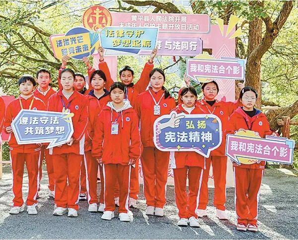 11月25日,貴州省黃平縣人民法院開展“法護新芽與法同行”主題開放日活動。活動中,師生們不僅在“憲法伴我成長”打卡點合影留念,更通過聆聽講解、沉浸式體驗司法流程,近距離感知憲法權(quán)威。圖為同學(xué)們在“憲法伴我成長”打卡點留影。