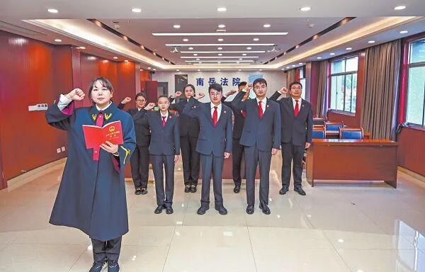 11月25日,湖南省衡陽市南岳區(qū)人民法院舉行青年干警憲法宣誓儀式。干警手持憲法、面向國徽莊嚴宣誓,誓言鏗鏘有力,彰顯出法院干警維護憲法權(quán)威、忠實履行法定職責的堅定信念。圖為宣誓現(xiàn)場。