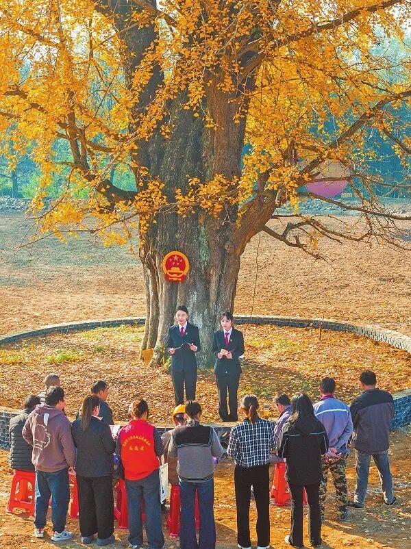 11月24日,安徽省宣城市宣州區(qū)人民法院干警走進“千年古鎮(zhèn)”水東鎮(zhèn)前進村,在一株千年銀杏樹下開展憲法宣傳活動。干警們向村民闡釋憲法精神與日常生活的緊密關(guān)聯(lián),引導(dǎo)大家既要珍視憲法賦予的權(quán)利,也要自覺履行憲法規(guī)定的義務(wù)。圖為普法現(xiàn)場。