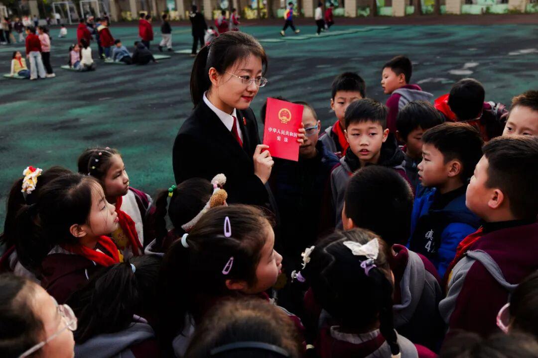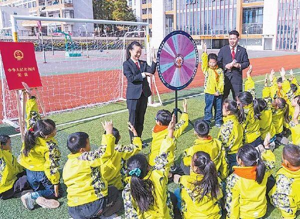 11月25日,浙江省長興縣人民法院走進泗安小學(xué)教育集團實驗校區(qū),開展“浙里有春風(fēng)·憲法護成長”普法宣傳活動。干警們首先向同學(xué)們介紹了國徽、法徽的設(shè)計含義,隨后通過“憲法大轉(zhuǎn)盤”“你問我答”等法治互動小游戲,帶領(lǐng)同學(xué)們沉浸式學(xué)憲法。圖為活動現(xiàn)場。