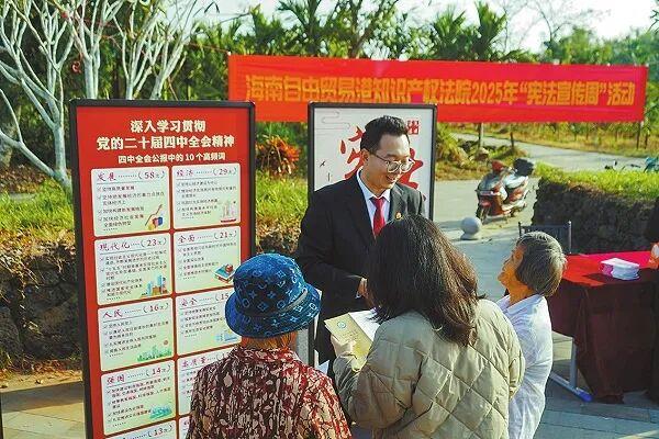 11月26日,海南自由貿(mào)易港知識產(chǎn)權(quán)法院組織干警走進海南省定安縣定城鎮(zhèn)水沖坡村,開展憲法宣傳活動。該院干警通過設(shè)置宣傳展板、現(xiàn)場講解等多種形式,用通俗易懂的語言向村民宣講黨的二十屆四中全會精神,普及憲法基本知識,并結(jié)合農(nóng)村實際,重點講解了與農(nóng)業(yè)生產(chǎn)、經(jīng)營相關(guān)的知識產(chǎn)權(quán)司法保護知識,以法治力量助力鄉(xiāng)村振興。圖為普法現(xiàn)場。