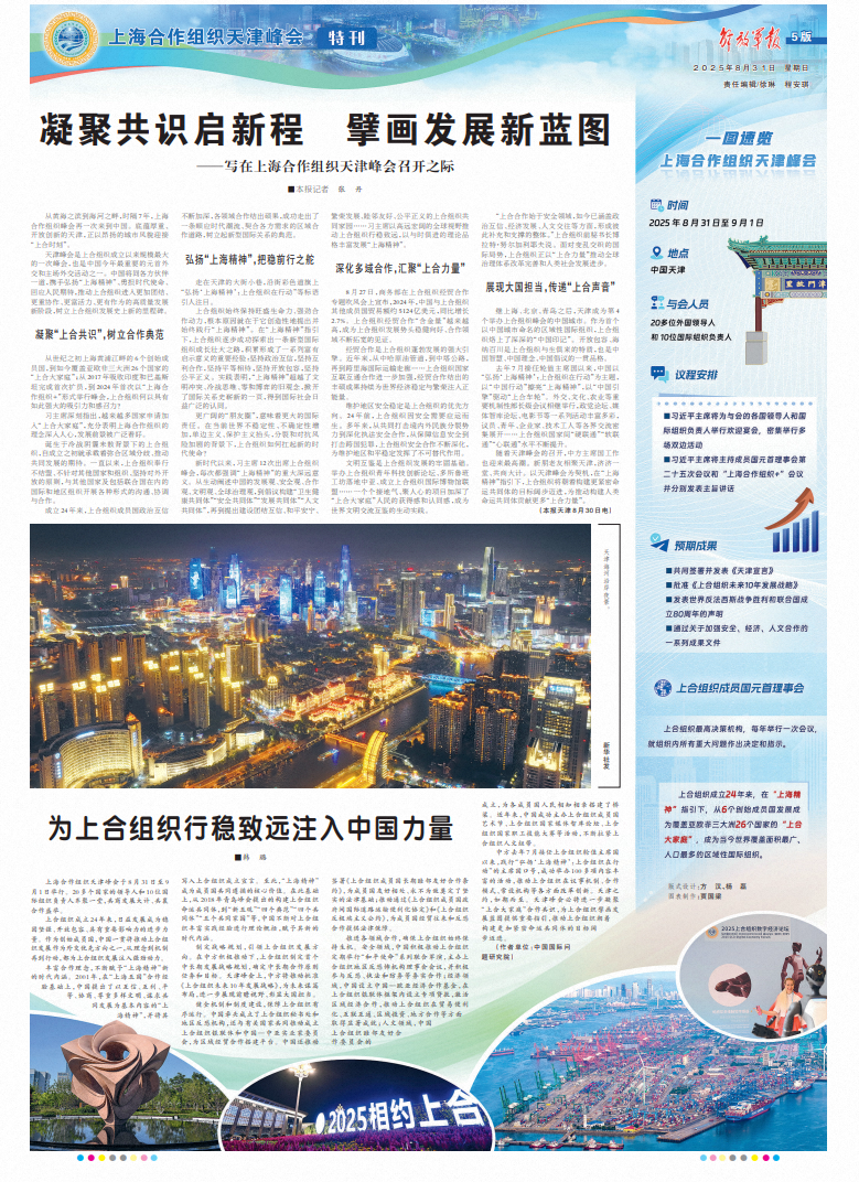 中方去年7月接任上合組織輪值主席國(guó)以來,踐行“弘揚(yáng)‘上海精神’:上合組織在行動(dòng)”的主席國(guó)口號(hào),成功舉辦100多項(xiàng)內(nèi)容豐富的活動(dòng),推動(dòng)上合組織在議事機(jī)制、合作模式、常設(shè)機(jī)構(gòu)等各方面改革創(chuàng)新。天津之約,如期而至。天津峰會(huì)必將進(jìn)一步凝聚“上合大家庭”合作共識(shí),為上合組織擘畫發(fā)展藍(lán)圖提供重要指引,推動(dòng)上合組織朝著構(gòu)建更加緊密命運(yùn)共同體的目標(biāo)闊步邁進(jìn)。