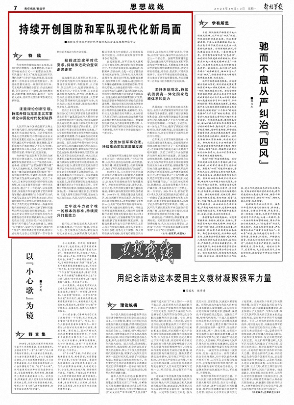 人民軍隊(duì)在中國特色強(qiáng)軍之路上擔(dān)當(dāng)時代重任、續(xù)寫時代新篇,一刻都離不開科學(xué)理論指引。習(xí)近平強(qiáng)軍思想是習(xí)近平新時代中國特色社會主義思想的重要組成部分,是新時代國防和軍隊(duì)建設(shè)的科學(xué)指南和根本遵循,是不斷發(fā)展的開放的理論?!笆奈濉睍r期,隨著強(qiáng)軍偉業(yè)深入推進(jìn),習(xí)近平強(qiáng)軍思想持續(xù)發(fā)展、不斷豐富、更加完善。