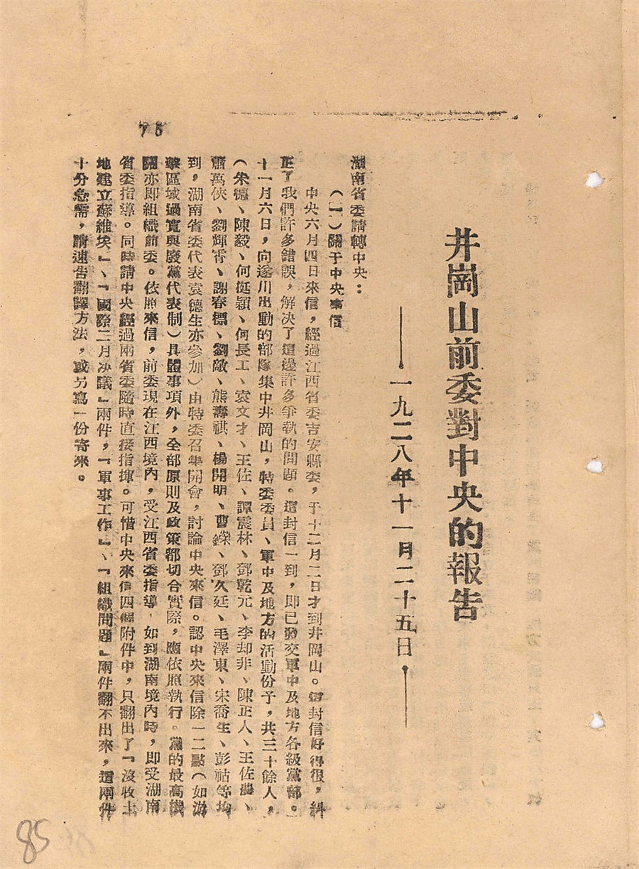 圖為《井岡山前委對(duì)中央的報(bào)告》首頁(yè),該報(bào)告收錄在1945年中共山東分局印發(fā)的《黨的路線問(wèn)題選集》。 解放軍檔案館提供
