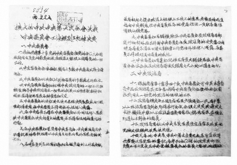 中共六屆六中全會(huì)制定的《關(guān)于中央委員會(huì)工作規(guī)則與紀(jì)律決定》(局部)。中央檔案館藏