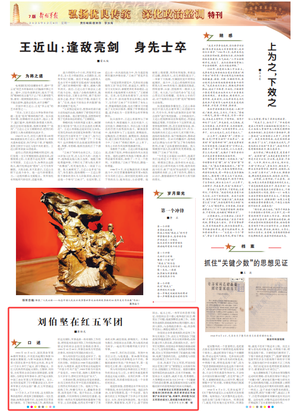 我與劉伯堅同志和派往紅五軍團工作的同志走馬上任,主要任務就是教育改造這支起義部隊。在我們共事一年多的時間里,我深感伯堅同志是一個非常好的同志。