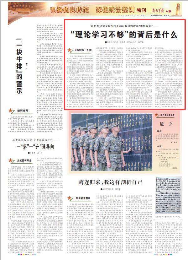 短短一周內(nèi),全旅干部自查自糾不再“躲躲閃閃”,而是直指群眾觀念出現(xiàn)偏差、政績(jī)觀出現(xiàn)偏差、擔(dān)當(dāng)意識(shí)出現(xiàn)偏差等3類“思想病灶”——